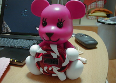 2000/10/163日間歳には勝てずオサボリしてました。今日の写真はモモの目覚し時計です。近くのキデ○○ンド探していた所メーカー品切れでして・・・。やっとゲット!