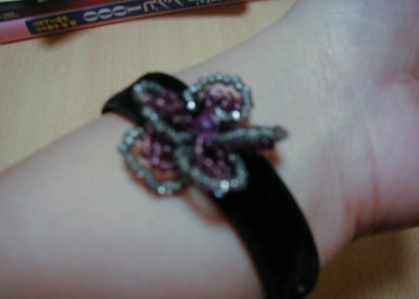 ビーズで花びらを5枚作り、ベルベットのリボンに縫い付けます。で、こんなん出来ました。どう??