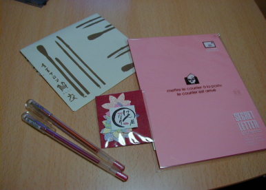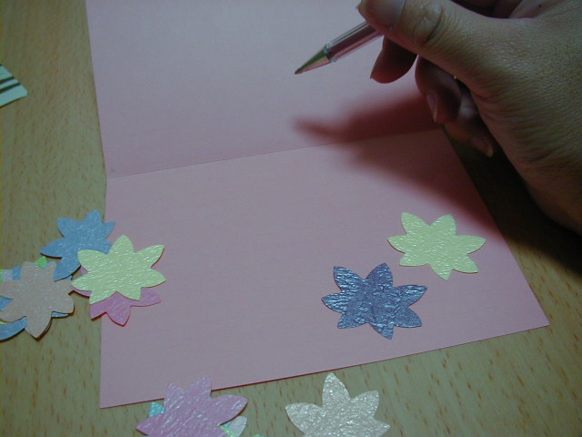 2000/10/26今日は「秋ハガキ」を作ろうと思いまして・・・。左の写真の右からシークレットレター50円で送れ、内容はハガキの2倍書けるところが良いのです。中央はこの前京都買った和紙で出来た紅葉のシール。左はペン茶が照柿、ピンクが深緋。お正月、暑中お見舞いはあるけど、秋も季節を取り入れて手紙書くのも良いのでは・・・。