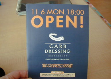 コンサートの帰り京阪・京橋の高架下に出来た「GARB DRESSING」に行きました。この日デジカメは持って行ってなかったので、パンフレットだけですが・・・。席も沢山あるし、遅くまでやってるので選びました。テイクアウトでパンやケーキもあります。そうそう、2階の奥にパーティースペースが・・・。扉の奥に・・・。見えないのでどんなのか見てみたい!フレンチ・イタリアンの料理はカジュアルで、値段もお手ごろで良かったです。