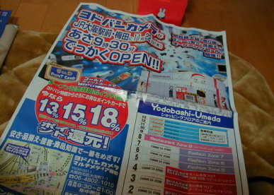 JR大阪駅の北側にOPENした「ヨドバシカメラ」! 数日前から、地元番組などで取り上げられていた、「混む!」とは解っていたのですが・・・。 今日9:30OPENで、私達は8:30に現地に到着。既に凄い人! 噂によると、OPENするまで1,500人程並んだとか・・・。 私達は20分後に店内に入れましたが、その頃には、「目玉商品」は売切れだったようです。 しかし、店内「めちゃ広い」ので、目的の所に行くのに大変!混んでいるのもあって、とにかく「疲れた〜」でした。 |