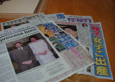 会社時代の友人宅を訪れた。そして、「雅子様のご出産」のニュースを知って喜んでいた。 そして、帰りJRの大阪駅で乗り換えた。想像通り号外ラッシュ!とにかく凄かった!数社の号外を取ろうとして、ごった返した。私も新聞社のを3、スポーツ新聞を2をゲットした。 なかなかスクープが出て、号外が出るときにそこに居るのは珍しい事です。 そして、帰宅して、HP作ってたら、結婚式に行ったダンナが帰宅 「珍しいぞ〜」と英文の号外!ホテルのフロントで配っていたらしい・・・。 とにもかくにも、「おめでたい!」 |