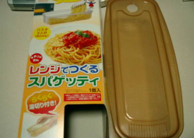 「レンジでつくるスパゲッティ」です。 以前CMで見て「良い!」って思って気になってました。 日頃、お昼をパスタにするので、重宝してます! パスタと水を入れて、決められた時間 (取説どおり)レンジに掛けるだけ。 お薦め!です。 |