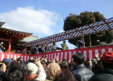 大阪は毎年「NHKの朝ドラ」メンバーが豆まきします。 休みの日だからめちゃ人多い。 近くには近寄れそうもないので、遠目に見学。 |