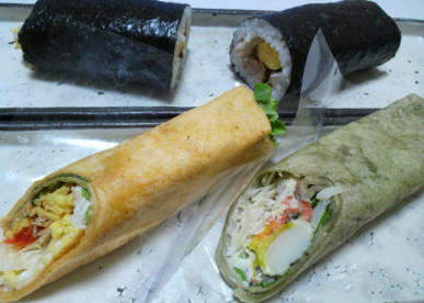 ちょっと変わり巻を・・・ 奥のが焼き鳥屋さんの恵方巻き。 手前のがサラダ屋さんのサラダトルティーヤ。 無病息災、良いことありますように! |