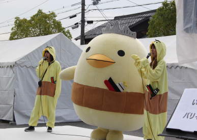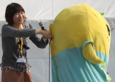 「ふなっしー」です。 2日間の中でこの日だけステージに出るので、目的がコレって人も多く! めちゃめちゃの人でした。 ま〜喋るってのが良いですよね! で、喋る時はこのように後ろからマイクを差し込みます! こんなところを見せるのも、ふなっしーらしい・・・。 |