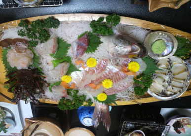 「相差町」 だから夕飯は凄いお魚料理! めちゃでかい船盛り! 食べきれない〜。 |